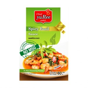 Spicy Basil dish or as known in Thai name “Pad Krapow”, one of the most popular Thai street food recipes, it is a fragrant mix of meat or vegatables fried with copious amounts of chilli, garlic and holy basil served with rice and fried egg if you wish. Chef Yuree is offering Spicy Basil Sauce for those who want to enjoy self making Pad Krapow dished, quick and easy, no more seasoning needed.