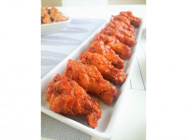 - Heat Korean spicy chicken sauce, add fried chicken, carrots, onion and chilli. Fry until cooked.