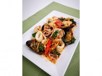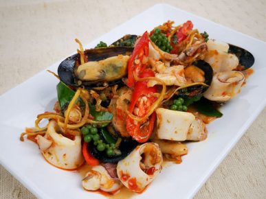 - Heat Pad cha paste until hot. Add squid and mussel stir together and mix well.