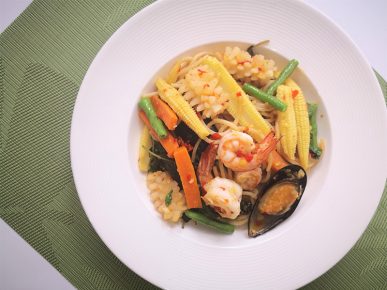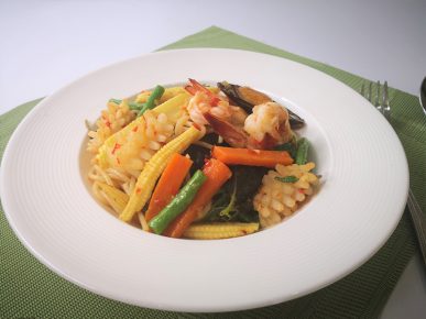 - Heat Pad kee mao sauce until hot. Add seafood, Spaghetti and vegetable. Stir together and mix well.