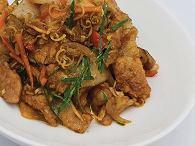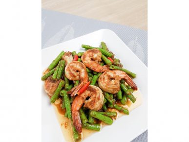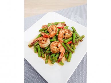 - Heat oil and put prawn. Fry until cooked, Add Shrimp paste stir fried sauce and long bean.