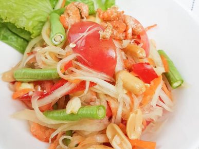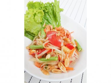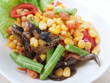 - Add kernel corn, dried shrimp, long bean, tomato, pickled crab and Som Tam sauce in mixing bowl. And toss well.