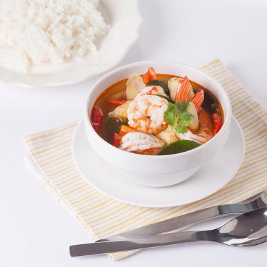 - Heat the soup stock or water 2 cups (500g) bring to boil then add Chef Yuree Tom Yam Paste 1 sachet (80g) contimue to the boil.