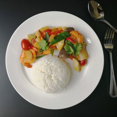 - Add the shrimp or sliced chicken 200g and mushroom 100g. Simmer for about 3 minutes until the shrimp or chicken are cooked.