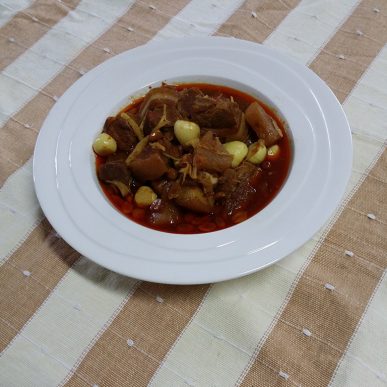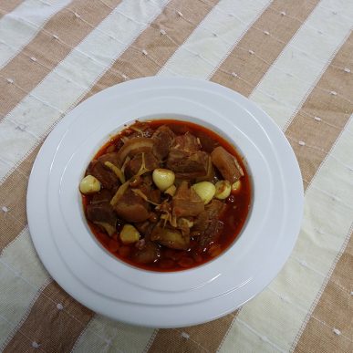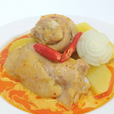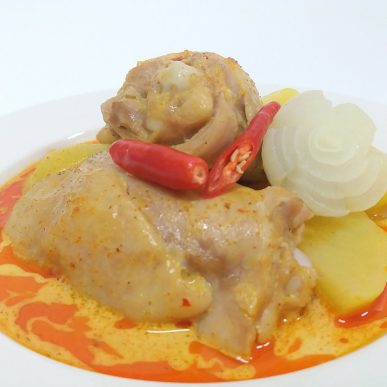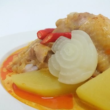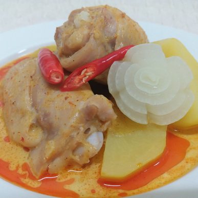 - Then add the sliced chicken or pork and cubed potato, sliced onion 50g. Turn the heat up to the boil, reduce the heat to low and cook further 5 minutes. Ready to serve.