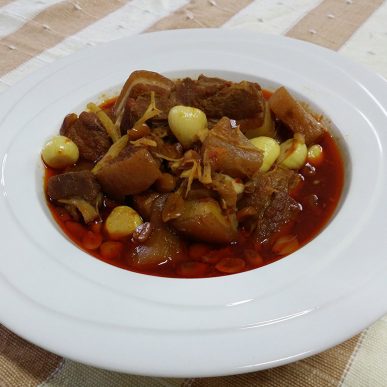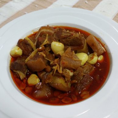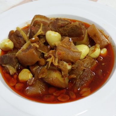 - Thiny slice the chicken or pork 250g and boil until cooked. Peel and cut potato 150g into small cubes and boil until cooked.