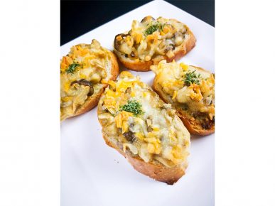 - ทาขนมปังด้วยซุปเห็ดที่ทำไว้ โรยหน้าด้วยชีส ตกแต่งด้วยใบพาสลีย์ให้สวยงาม